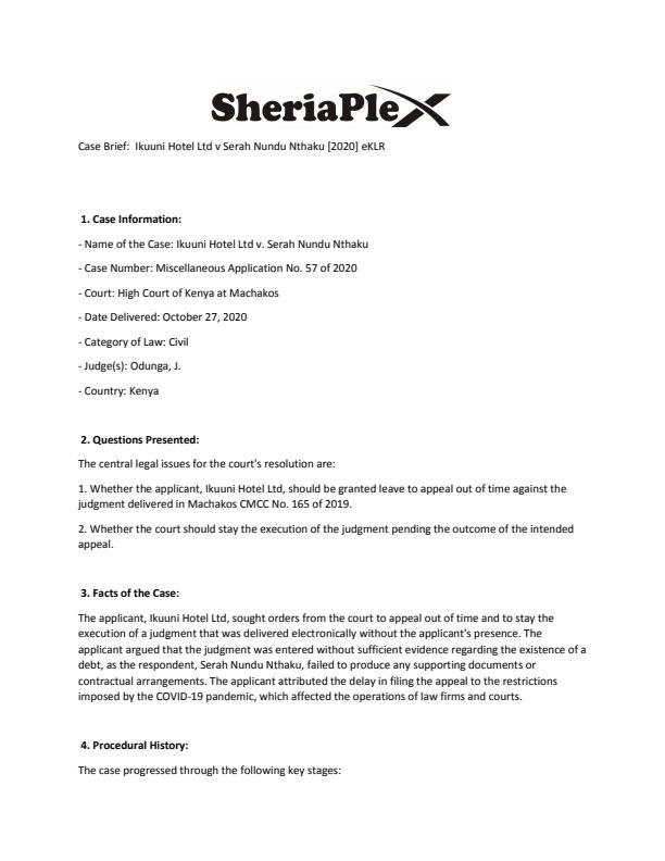 The High Court of Kenya at Machakos ruled in favor of Ikuuni Hotel Ltd, granting them leave to appeal out of time against the judgment in favor of Serah Nundu Nthaku. The court also stayed the execution of the judgment on the condition that the applicant pays part of the decretal sum and deposits the remaining amount in a joint account. This case underscores the court's willingness to adapt to extraordinary circumstances like the COVID-19 pandemic while balancing the rights of both parties involved.