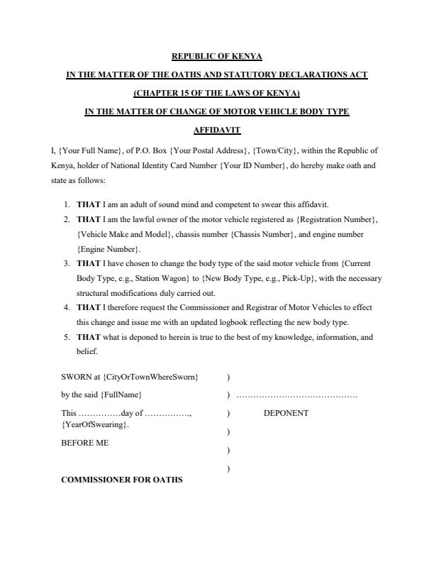 An Affidavit for Change of Motor Vehicle Body Type is a sworn statement made by a vehicle owner declaring that the structure or classification of their vehicle (e.g., from saloon to pick-up, or from lorry to tanker) has been modified.